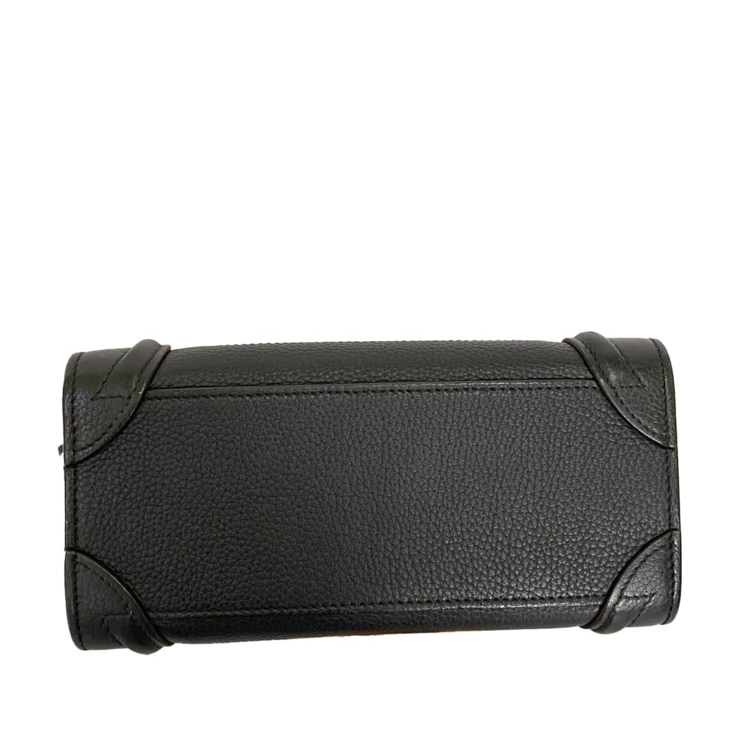 The Celine Nano Luggage Tote is crafted from smooth leather in black, featuring the iconic structured silhouette and signature front zip detail. Compact yet functional, it comes with a detachable strap for versatile styling.