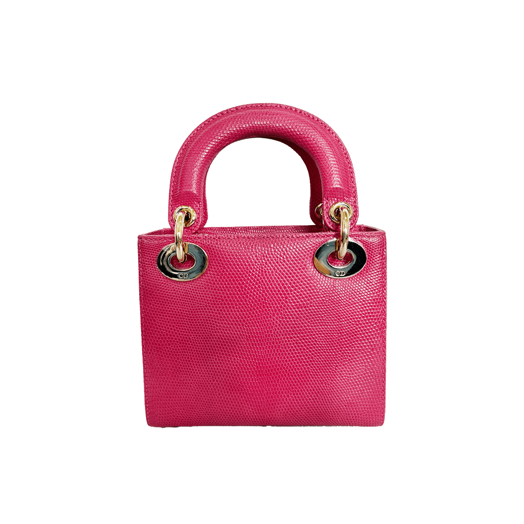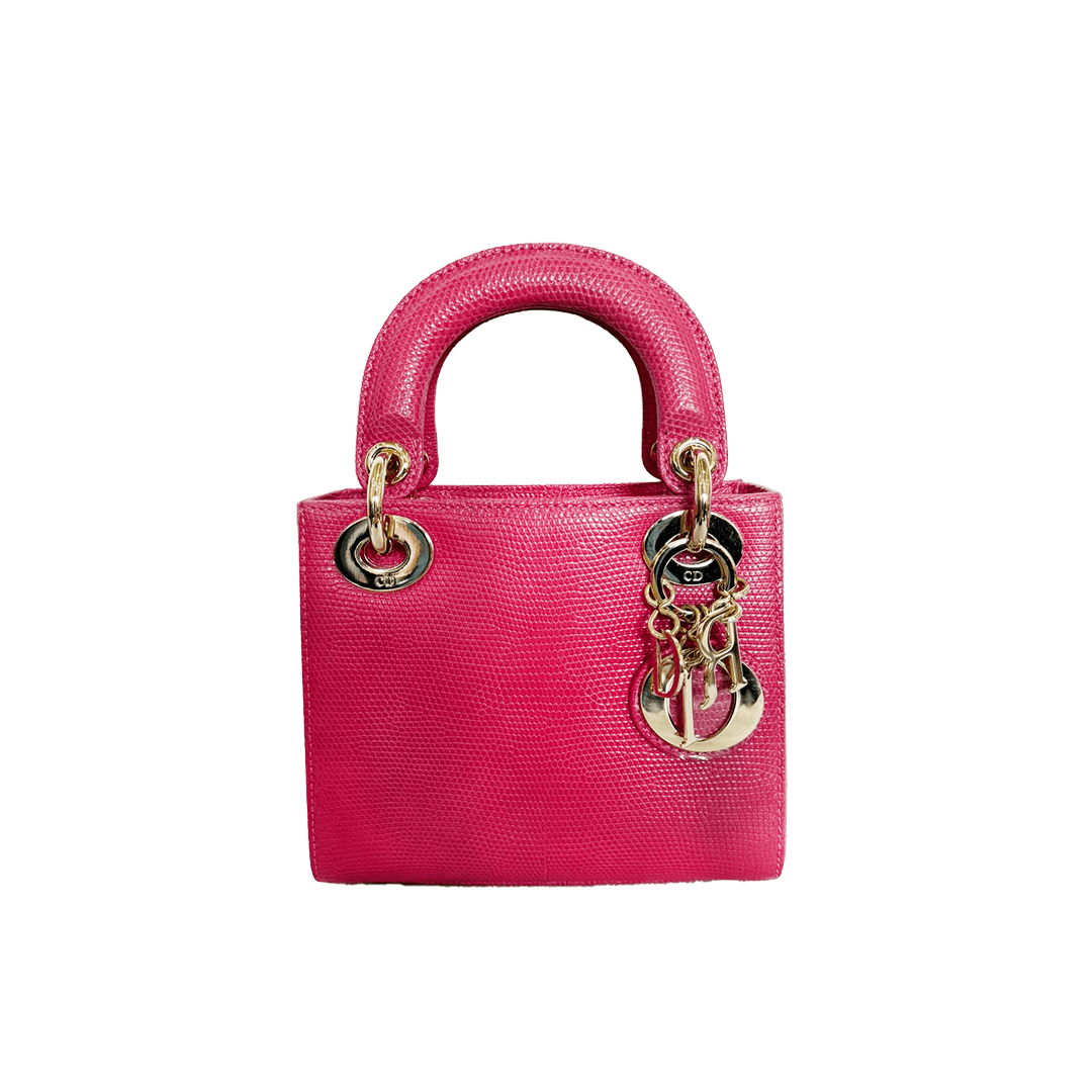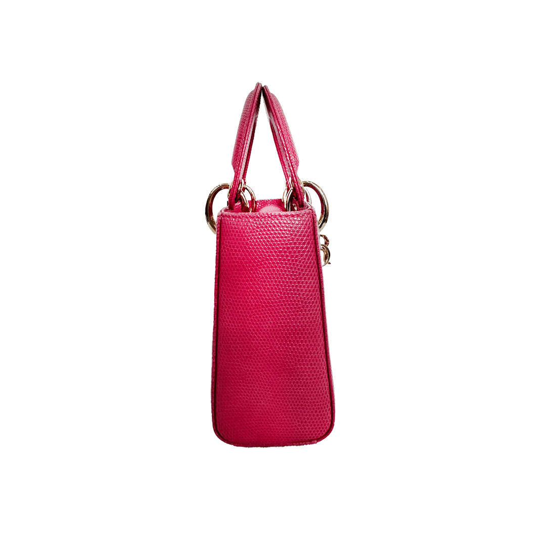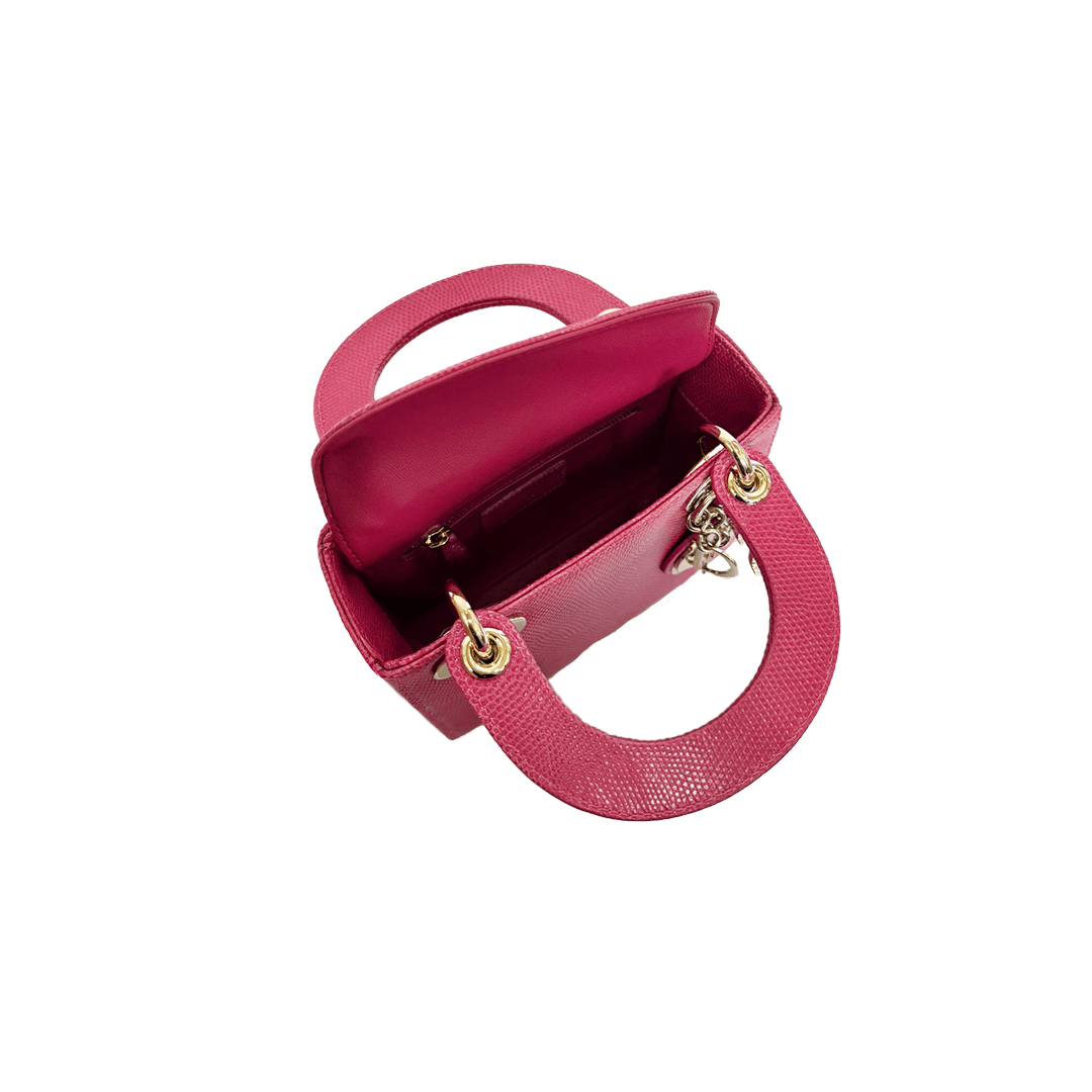 The Lady Dior is crafted from luxurious pink lizard leather, featuring signature Cannage quilting and “D.I.O.R.” charms. Elegant and exclusive, it is perfect for sophisticated day-to-evening styling.