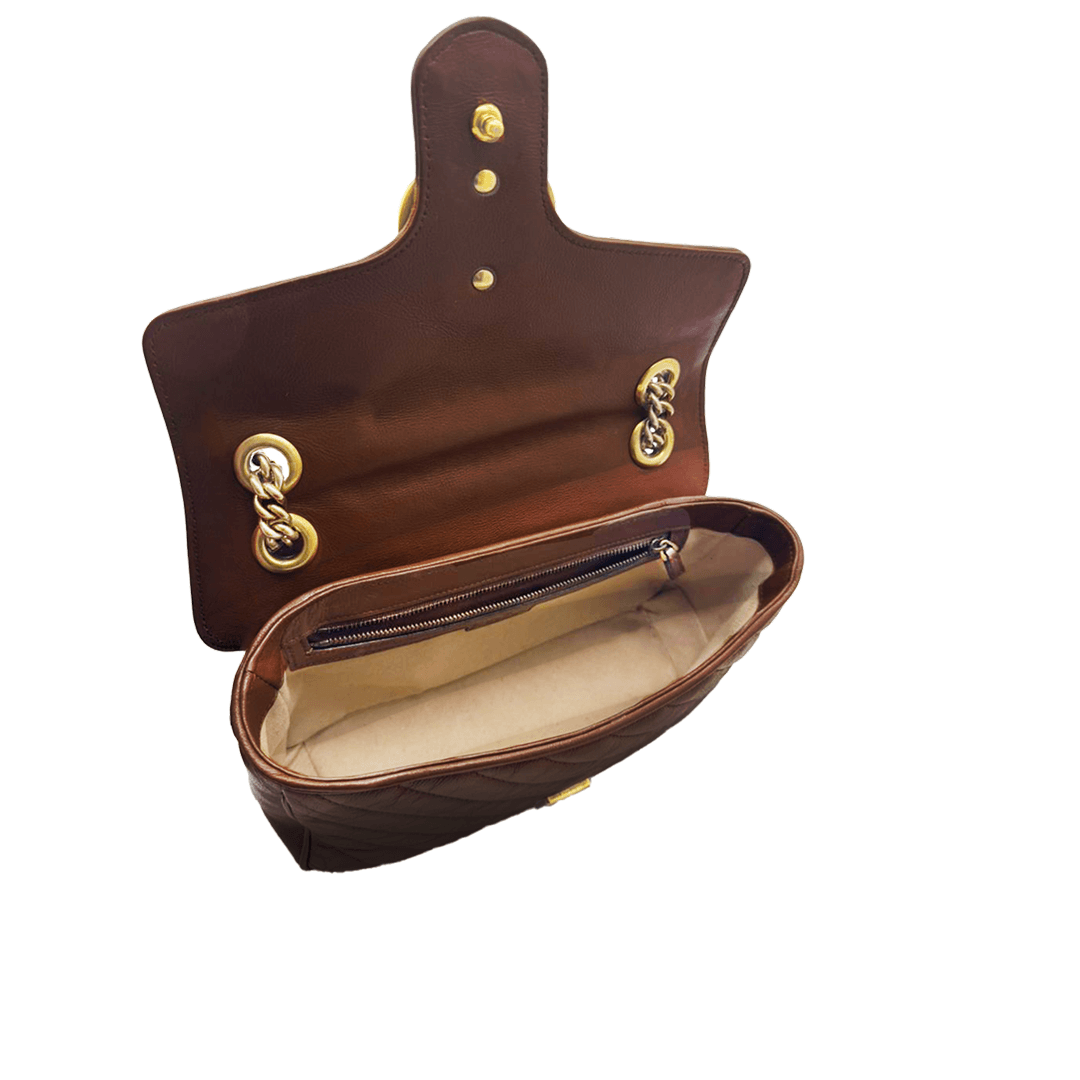 The Gucci Marmont features soft matelassé leather with signature chevron quilting and the iconic Double G logo. Finished with a chain strap, it can be worn shoulder or crossbody—perfect for everyday chic.