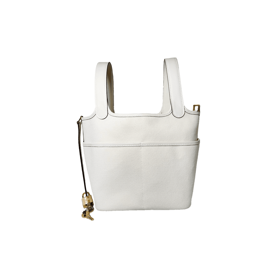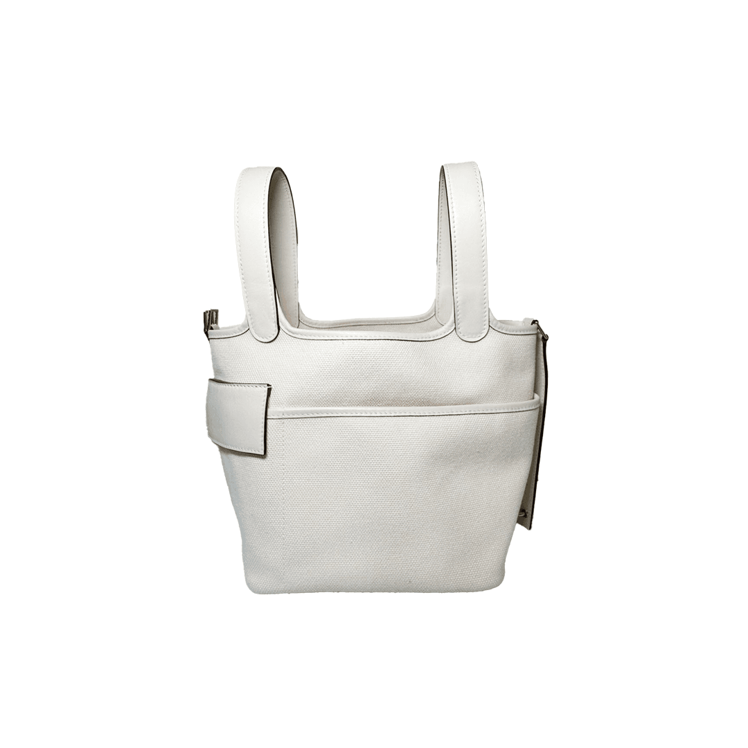 The Hermès Picotin Cargo 18 is crafted from ecru canvas with Swift leather trim, featuring a functional cargo-style design and signature padlock with gold hardware. Stylish and practical, it is perfect for everyday use.
