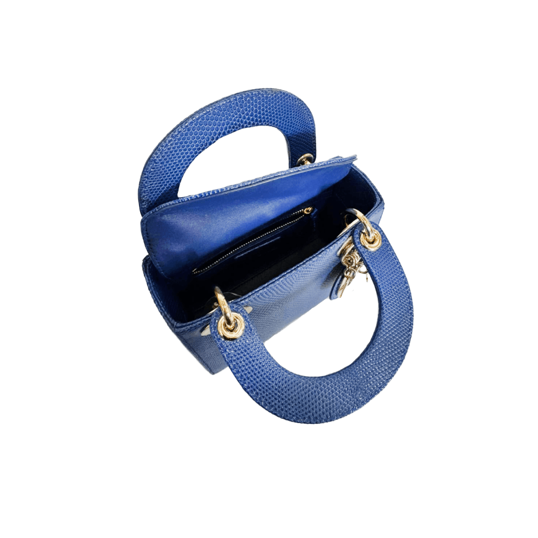 The Lady Dior is crafted from luxurious blue lizard leather, featuring signature Cannage quilting and “D.I.O.R.” charms. Elegant and exclusive, it is perfect for sophisticated day-to-evening styling.