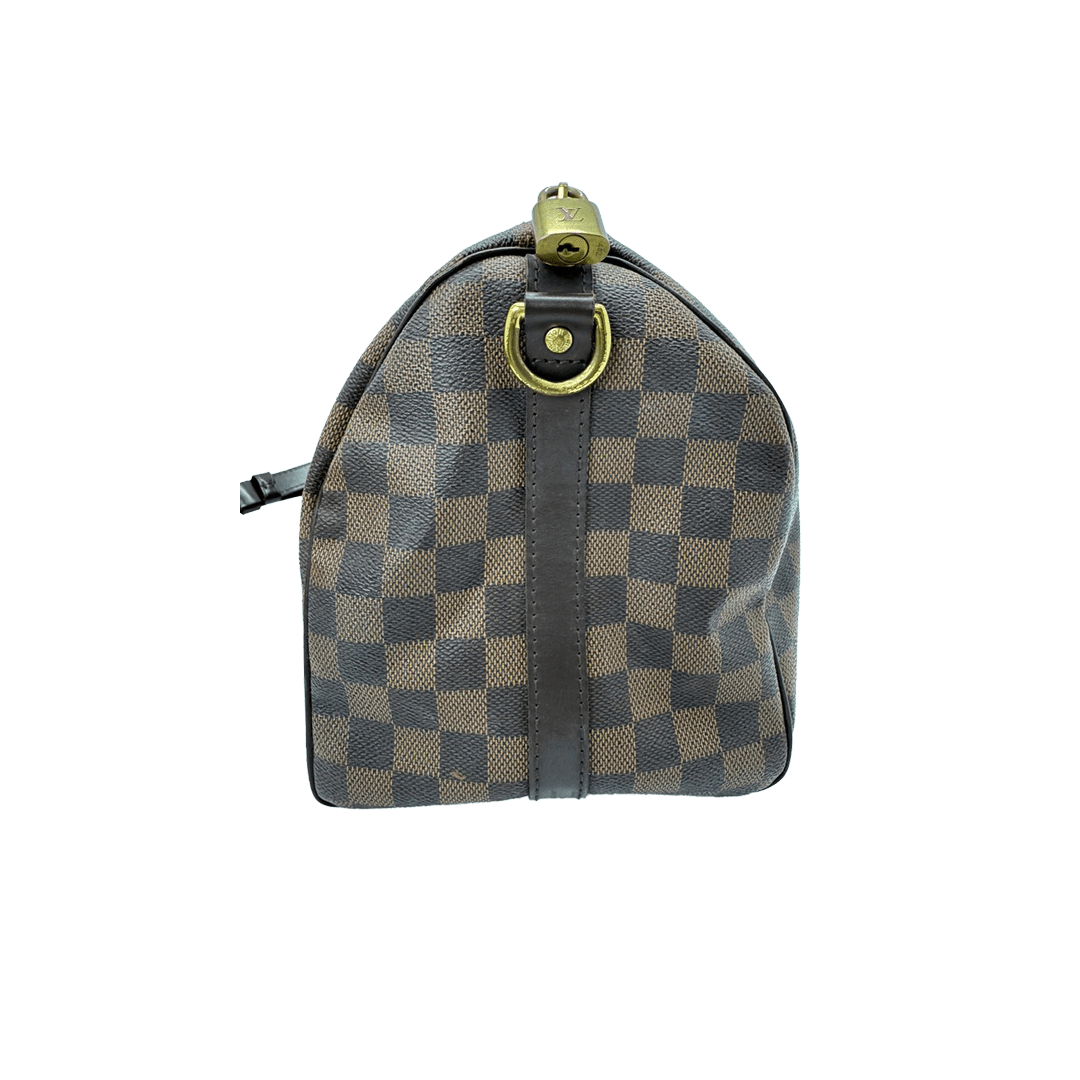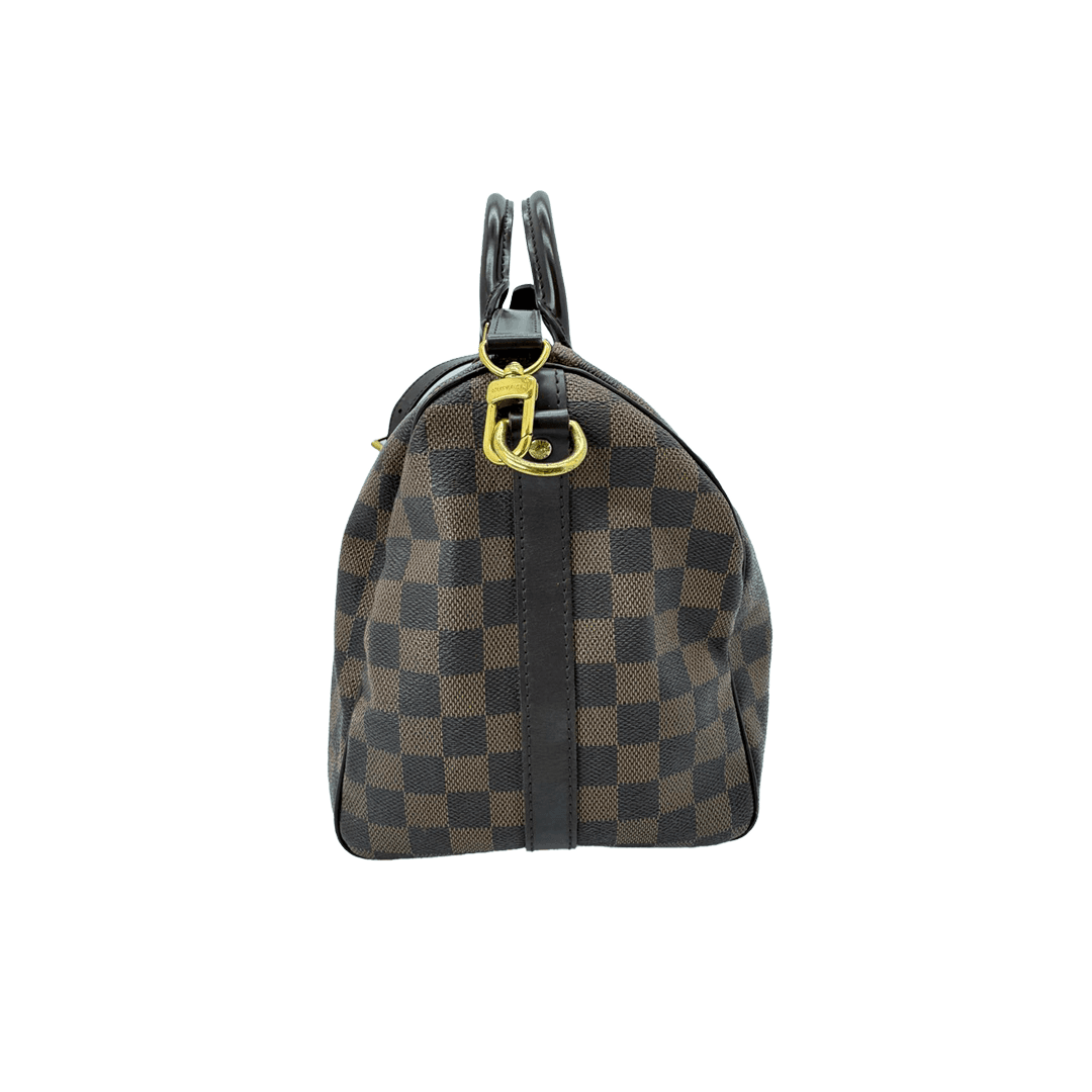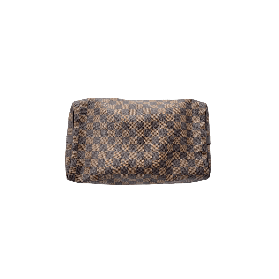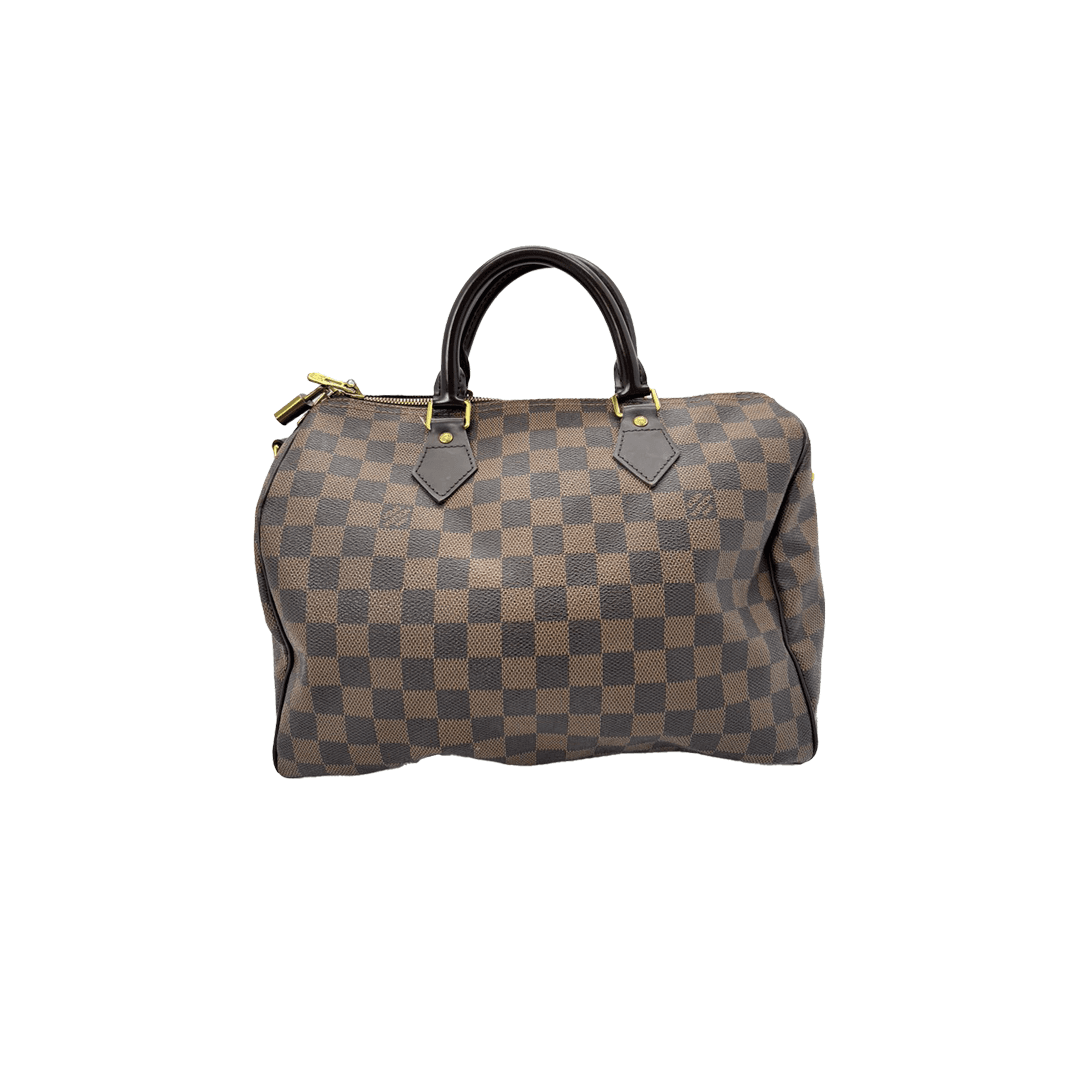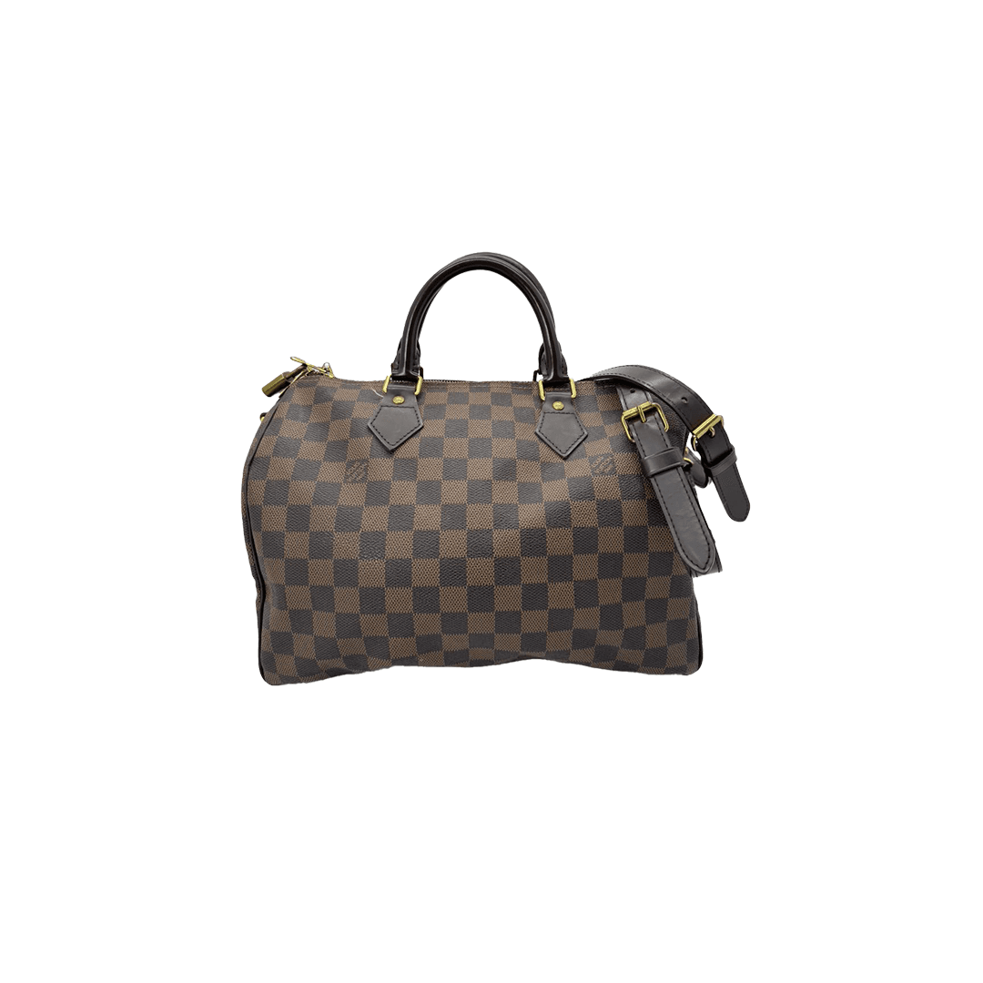 The Louis Vuitton Speedy Bandoulière 30 is crafted from signature Damier Ebene coated canvas with smooth leather trim, featuring a spacious interior and top handles. Timeless and versatile, it comes with a detachable shoulder strap for everyday and travel use.
