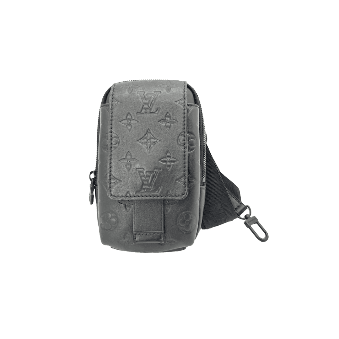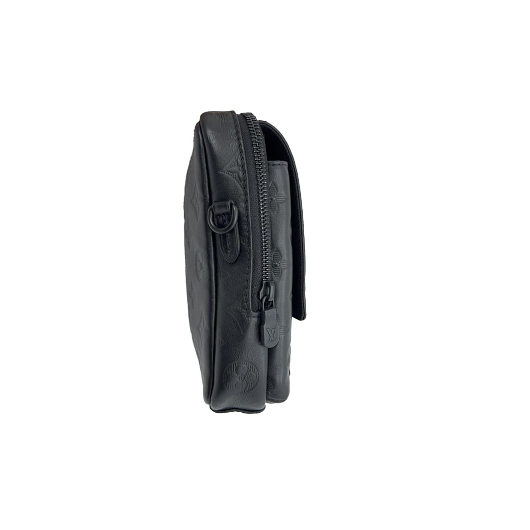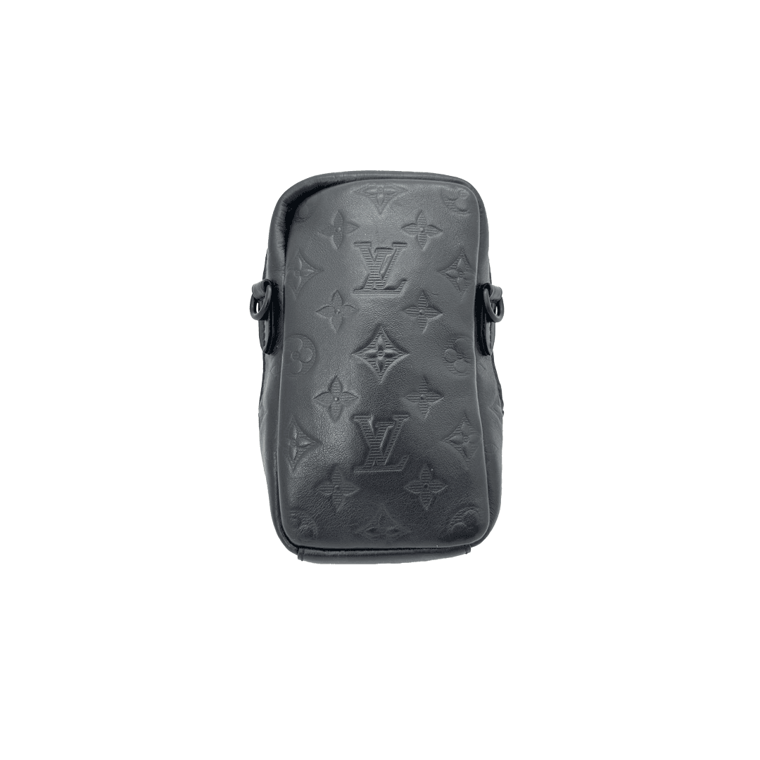 The Louis Vuitton Double Phone Pouch NM is crafted from Monogram Shadow embossed leather in black, featuring a sleek silhouette and adjustable strap. Compact and functional, it is perfect for carrying essentials in style.